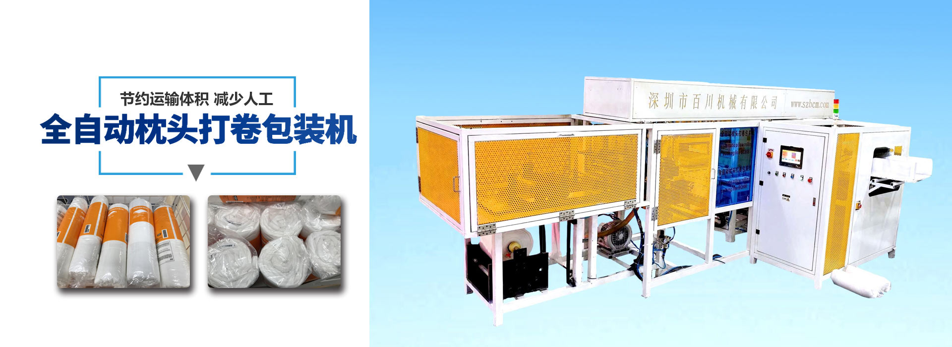 本系列全自動/半自動 自動壓縮、自動打卷、自動封口,節約枕頭運輸體積,減少人工。觸摸屏人機對話。